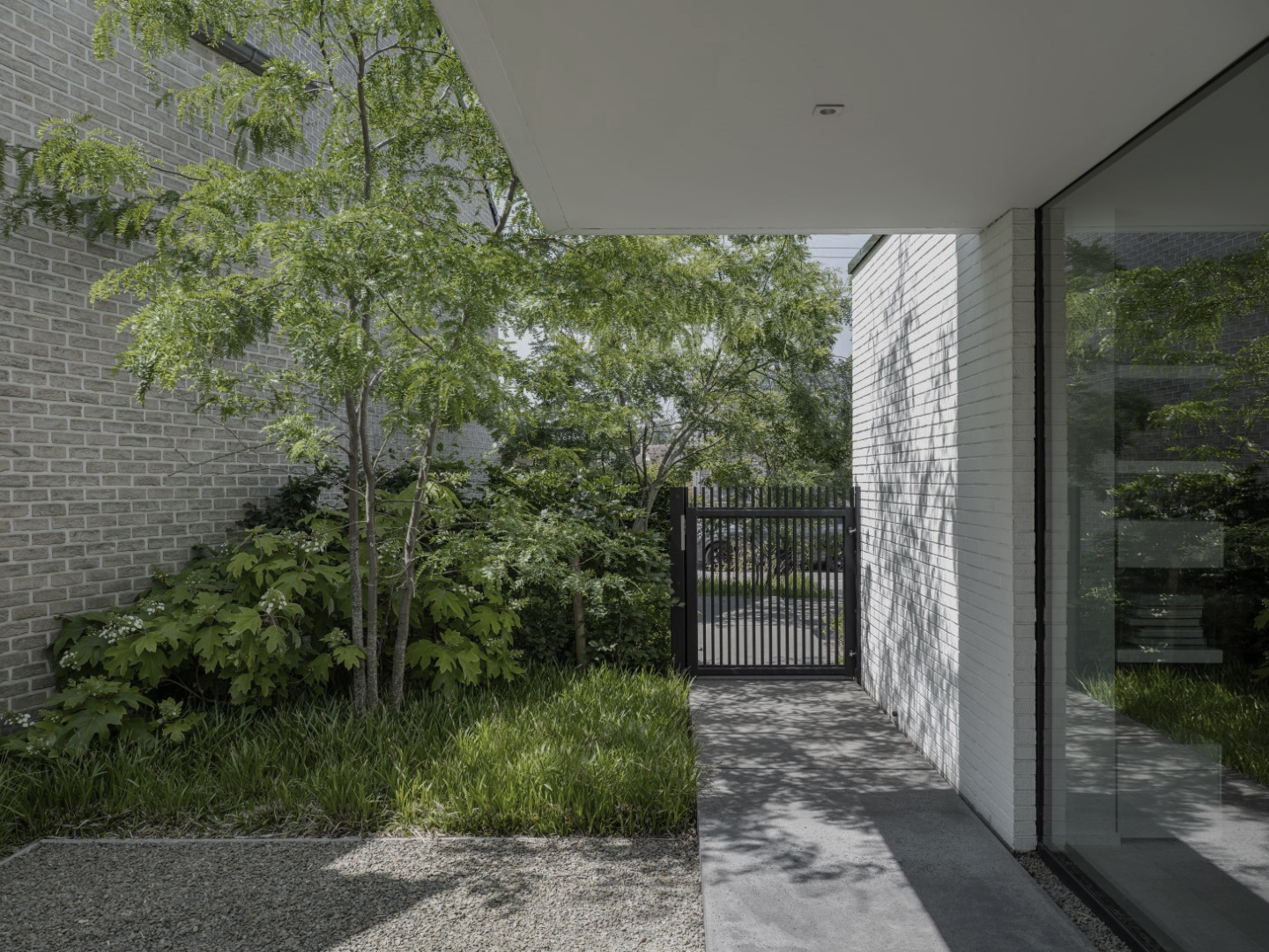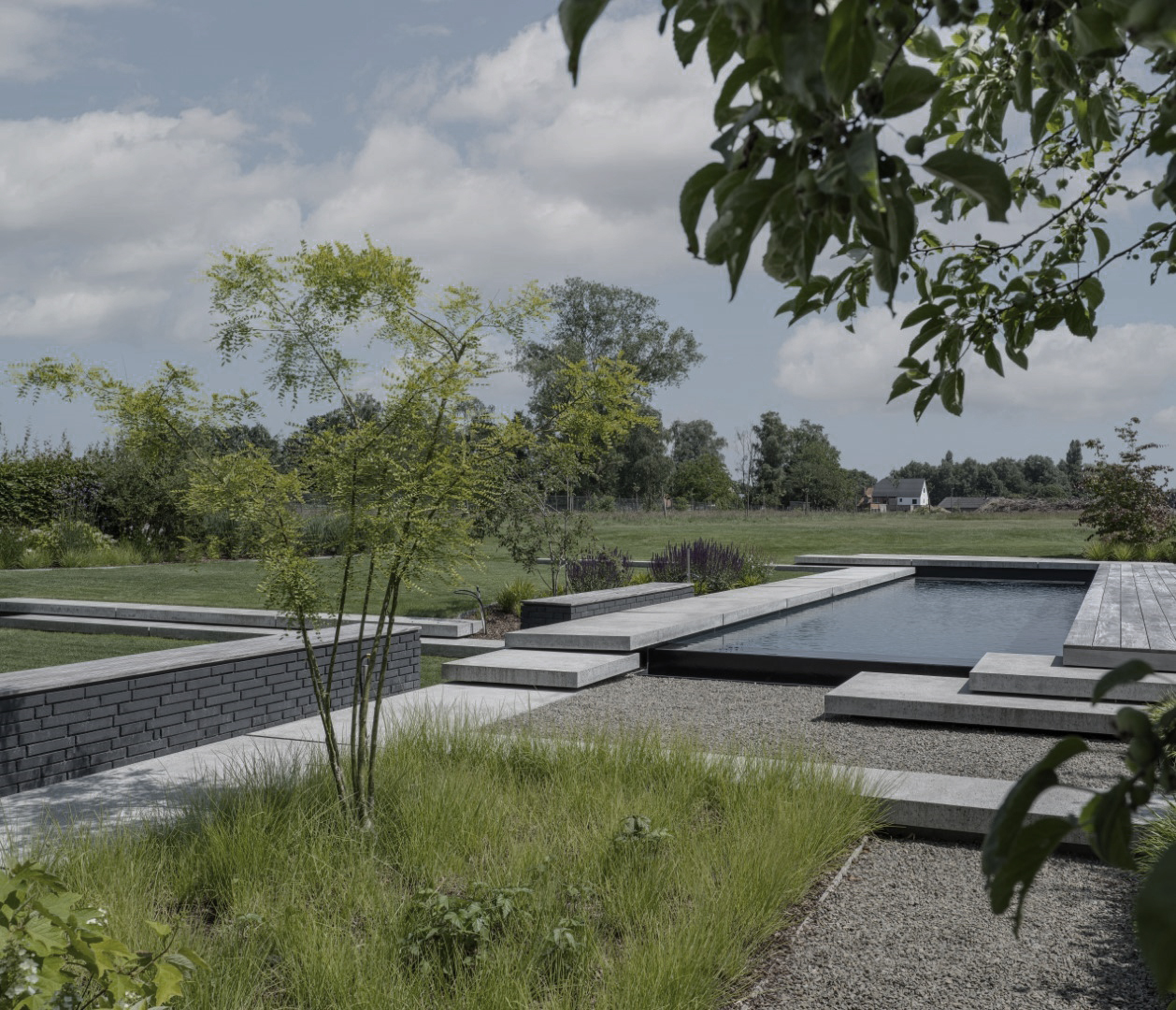 Het zwembad vormt het centrale element in de achtertuin: een sobere spiegel die de rechte lijnen van de architectuur verlengt. Rondom zorgen grasvlakken, hagen en luchtige beplanting voor evenwicht en zachtheid. De stapstenen en terrassen leiden je vanzelf van het huis naar het water, met telkens een nieuw perspectief.