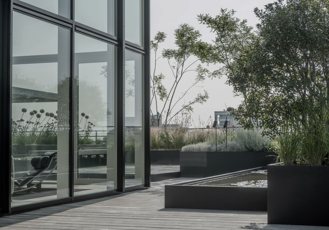 Hoog boven de stad kreeg deze ruime daktuin een vormgeving die het interieur naadloos verlengt. Alles ademt hier zorg voor detail en een gevoel van luxe rust. Strakke lijnen, maatwerk in staal en een subtiele waterpartij maken van deze buitenruimte een ingetogen maar krachtige blikvanger.