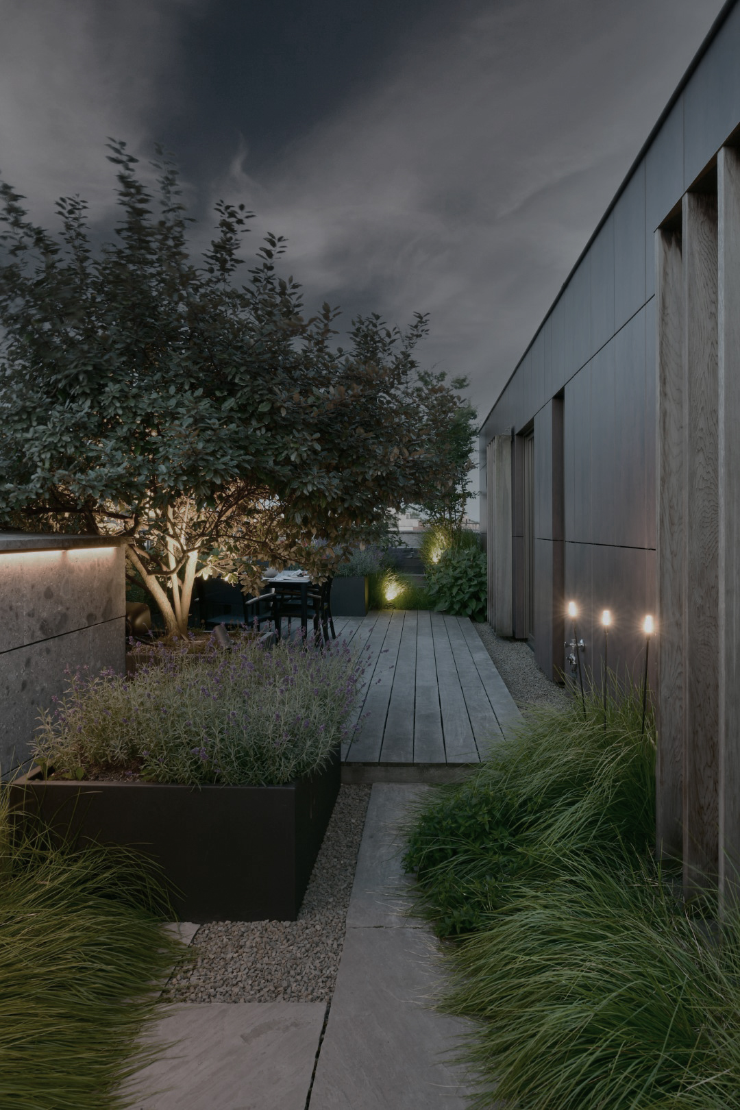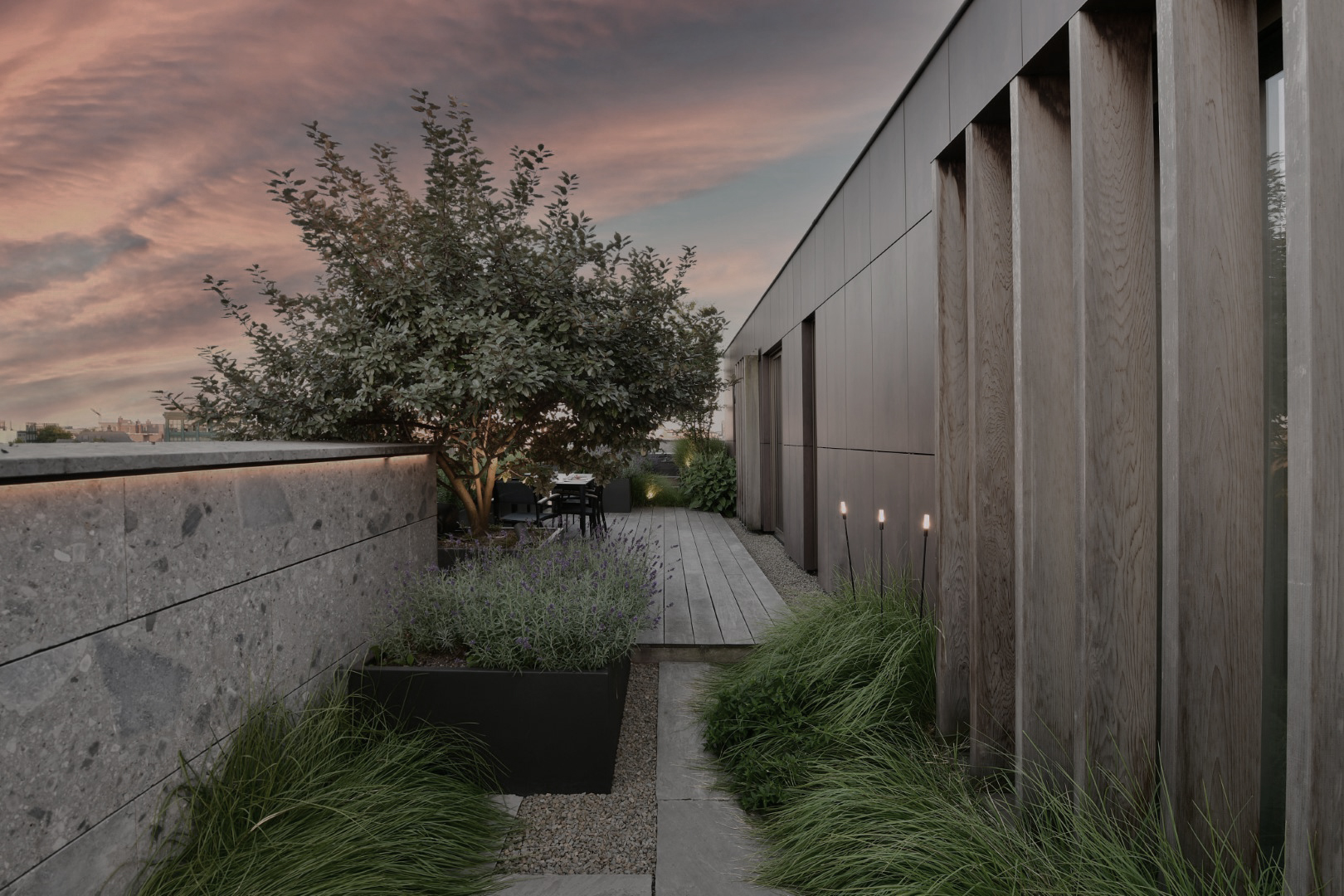 De verhuis van een ruime tuin naar een penthouse met dakterras bracht bij familie B een uitdaging mee: hoe maak je van een stedelijke omgeving een warme, groene plek? Het antwoord lag in een doordacht ontwerp dat het buitengevoel tot bovenin voortzet.