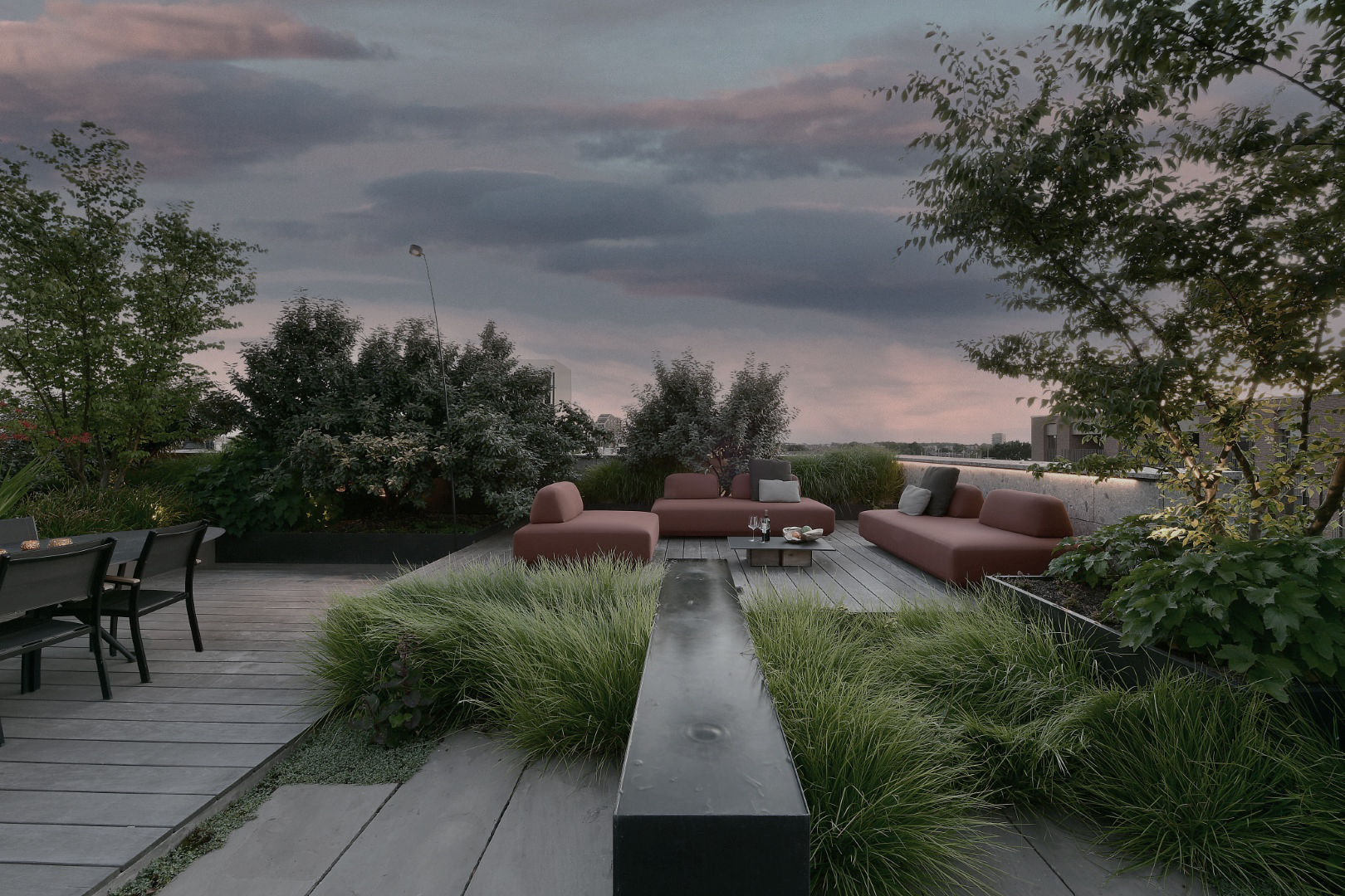 Met grote raampartijen werd het groen rechtstreeks verbonden met het interieur. De beplanting groeit zelfs op substraten op de dakbedekking, en sluit naadloos aan op de ramen. Om minder fraaie elementen in de omgeving te verzachten, creëerden we volumerijke groene buffers in bakken en vaste structuren. De daktuin loopt rondom het penthouse en biedt diverse zitplekken, uitnodigend op elk moment van de dag. Centraal prijkt een sfeervolle waterbak die rust en koelte brengt.
