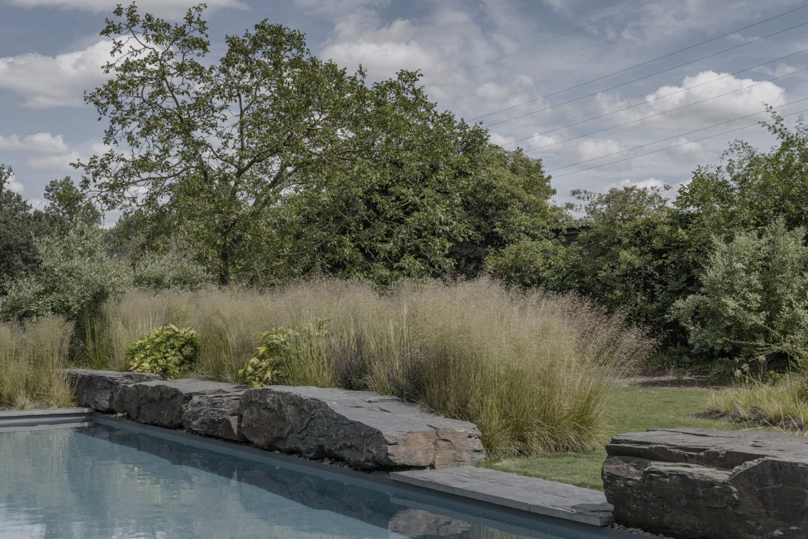 De binnenkoer kreeg een subtiele groene invulling, zonder de charme van de aanwezige verhardingen te verliezen. Inheemse bomen en planten zorgen voor een rijke gelaagdheid en trekken de omgeving tot dicht bij de woning. De zwemvijver is aangekleed met ruwe natuursteenblokken, die tegelijk een blikvanger en een speels element vormen. Zo vloeien natuur, water en architectuur moeiteloos samen.