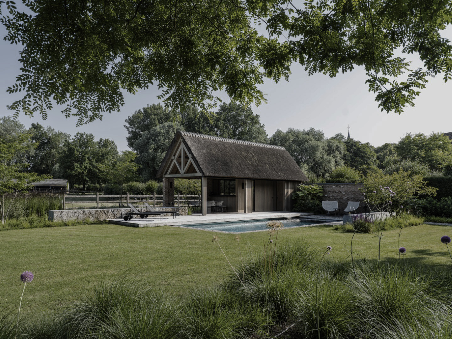 De bewoners wilden een landelijke poolhouse die niet schreeuwt om aandacht, maar opgaat in de natuur. Een plek om te ontspannen bij het water, omringd door rust en ruimte.