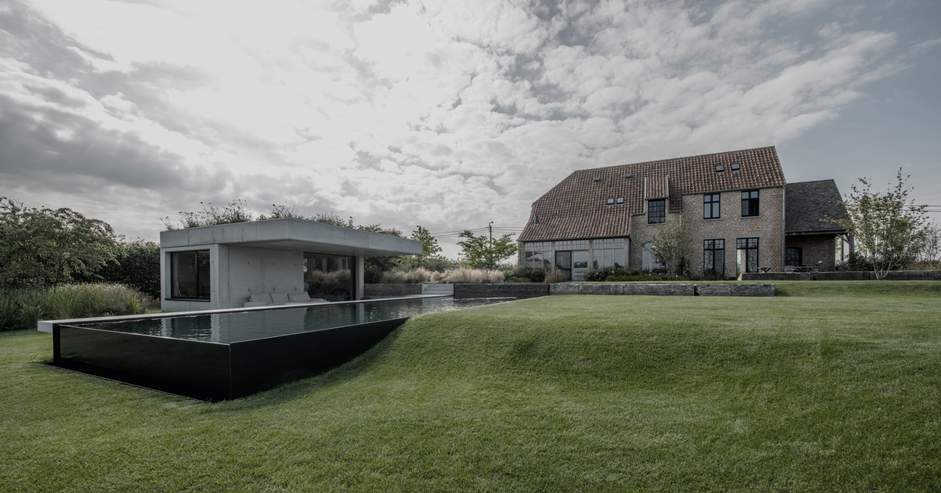 Een tuin die het hoogteverschil van de woning elegant opvangt, met een sfeervolle zwemvijver en een poolhouse dat contrasteert maar toch harmonieert met de omgeving. Daarnaast moest de voortuin ruimtelijk en groen zijn, met voldoende plaats voor parkeren.