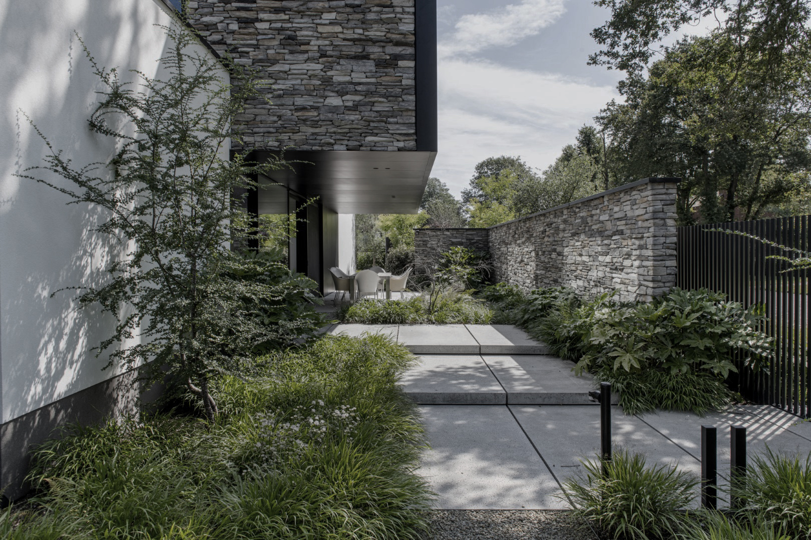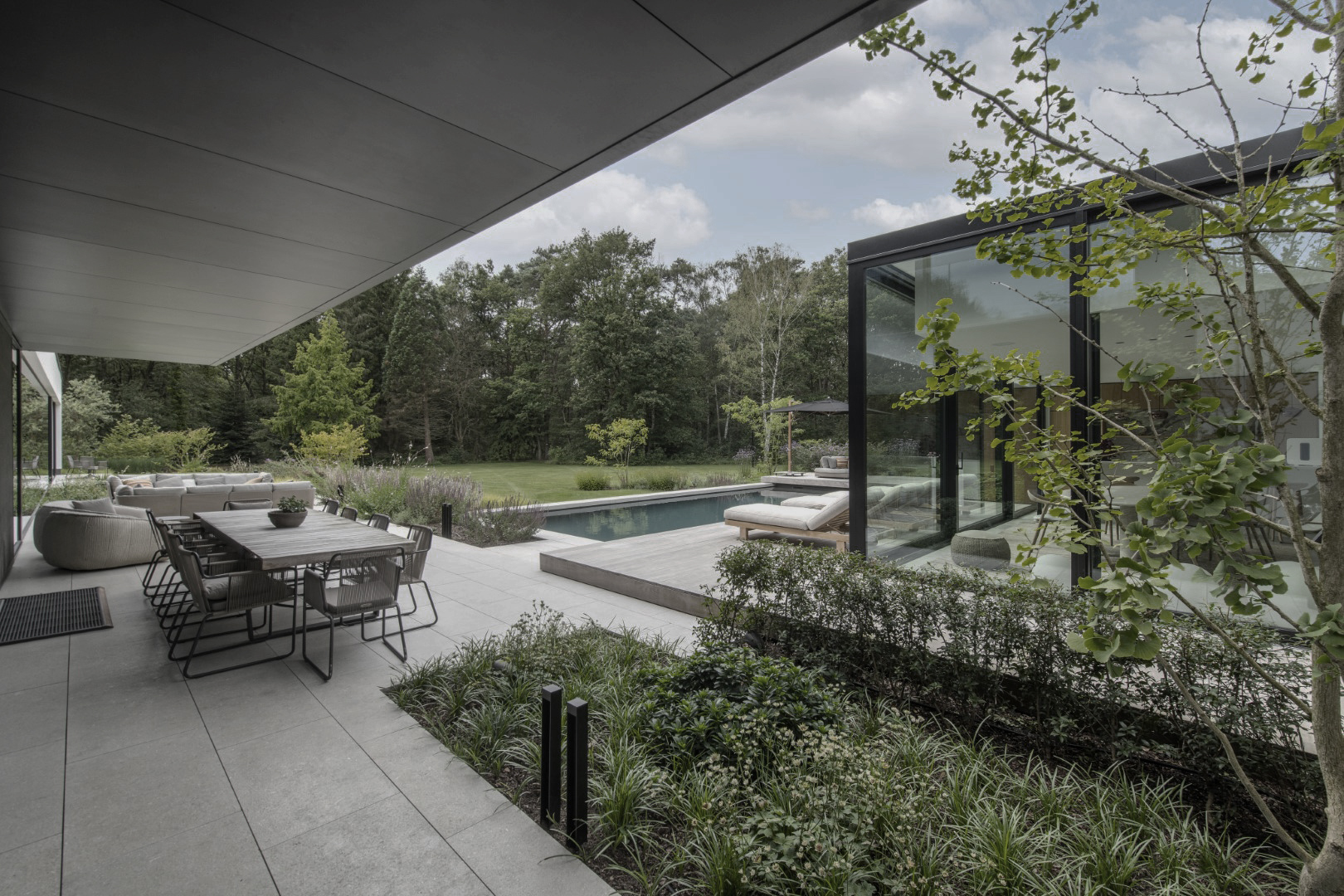 In de voortuin zorgen royale groenmassieven voor knusheid, ondanks het gebruik van veel grote betonplaten. De inkompartij loopt door naar een patiotuin, waar je volledig afgesloten van de straat in alle rust kunt zitten. Achteraan liggen ruime terrassen die zowel praktisch als uitnodigend zijn. Het zwembad en poolhouse zijn subtiel omsloten door groen, zodat de connectie met het landschap behouden blijft. De grote oppervlakte van de tuin met zwembad zorgt voor een ruimtelijk, open gevoel, terwijl het groen de tuin tot leven brengt.
