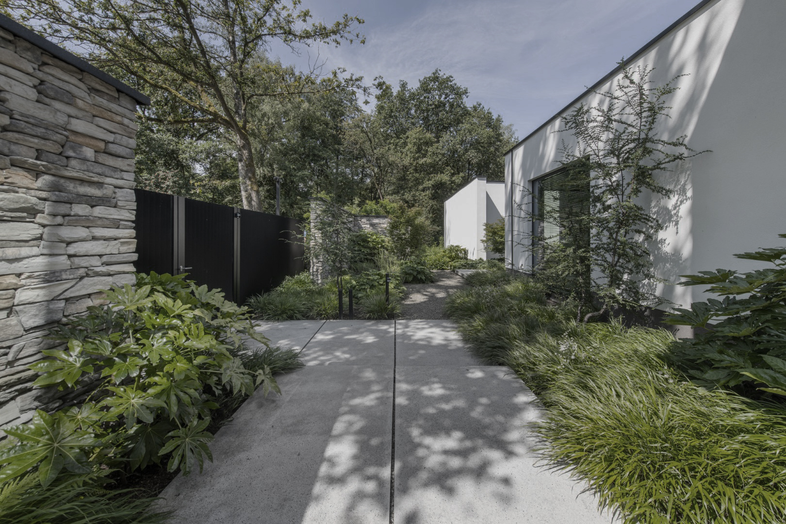 De wens: een moderne tuin met zwembad die toch een knipoog geeft naar de omliggende bosrijke omgeving. De omsloten voortuin moest tegelijk ook als patiotuin functioneren. Een plek om beschut en gezellig te vertoeven. Daarnaast vroegen ruime parkeerzones om een doordachte indeling die past bij de schaal van de tuin. In de achtertuin stonden het zwembad en poolhouse centraal in de plannen, naadloos geïntegreerd in het geheel.