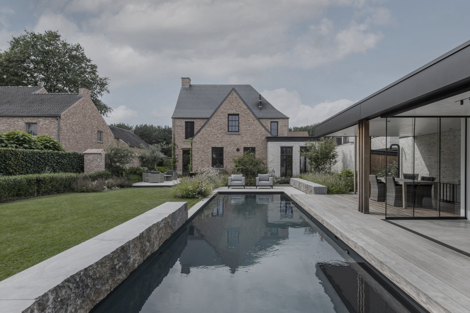Voor familie C realiseerden we een totaalproject waarbij de tuin het strakke, landelijke karakter van de woning versterkt. Centraal stonden een ruim zwembad met poolhouse en een slimme indeling die privacy en openheid in balans brengt.