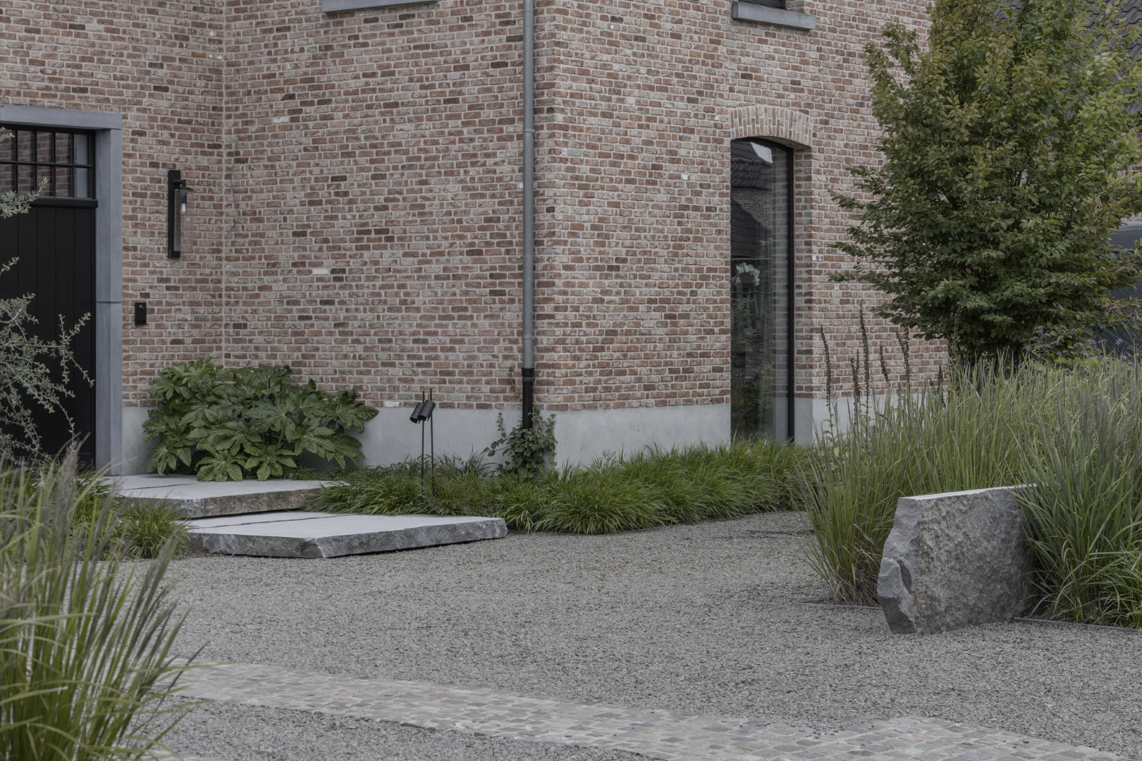 De voortuin wordt omsloten door groen, waardoor het ruime parkeren subtiel wordt gemaskeerd. Het karrenspoor zorgt voor een lichte, uitnodigende oprit die de massiviteit doorbreekt. Bovendien creëren tuinmuren een duidelijke, maar zachte afscheiding naar de straat toe.