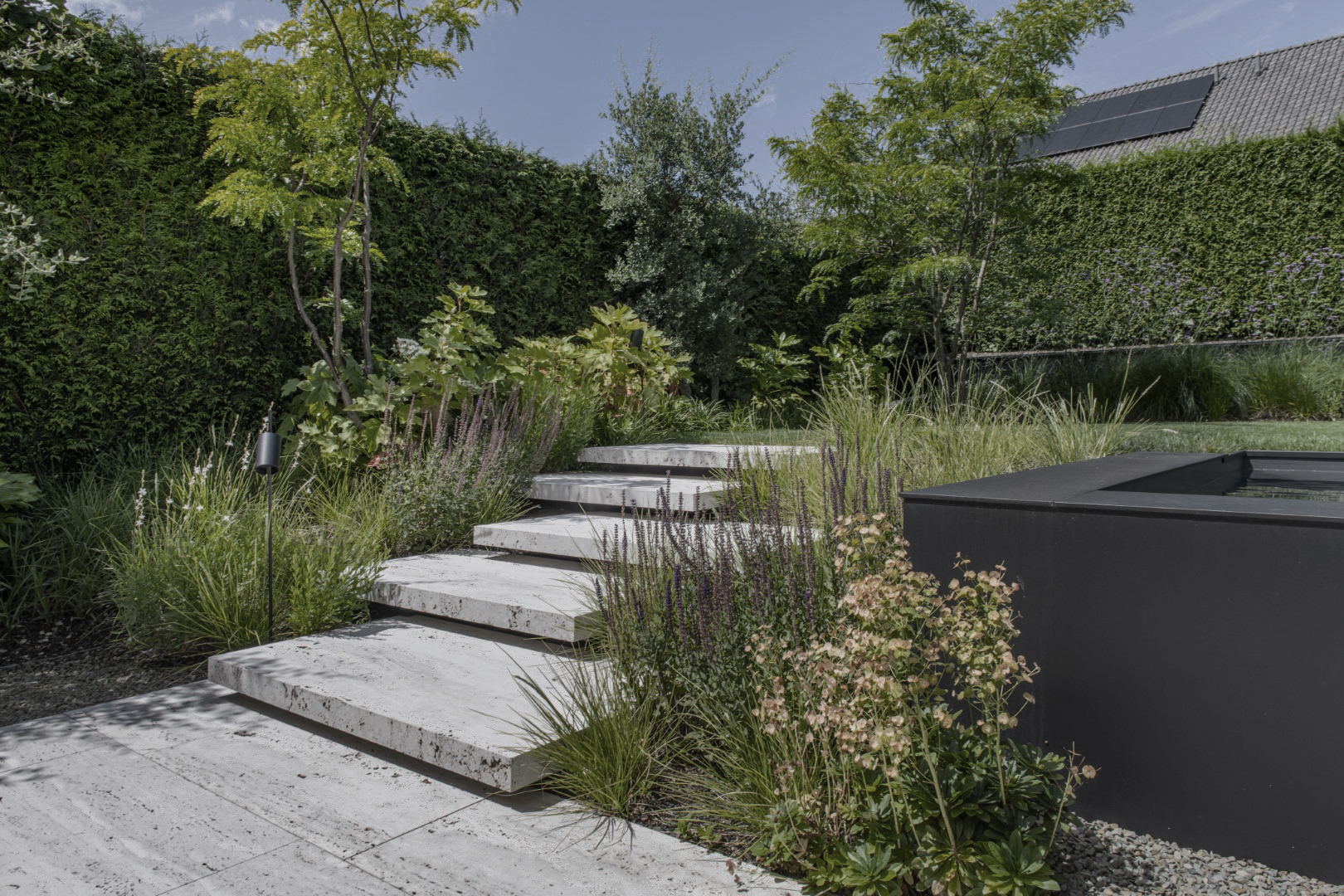 Het ruime terras sluit direct aan op de woning en het zwembad, waardoor binnen en buiten één geheel vormen. Het zwembad vangt niet alleen het hoogteverschil op, maar wordt ook een blikvanger met zijn strak, zwart gelakte stalen omkadering. Via elegante trappen bereik je de hoger gelegen achtertuin en een vlonder tussen het groen. De wintergroene solitairen bieden het hele jaar door privacy, terwijl de beplanting onderhoudsvriendelijk en sereen blijft.