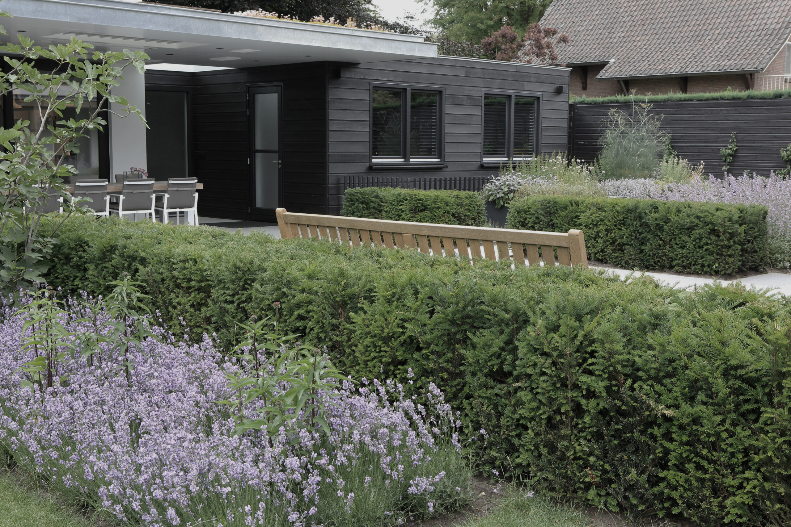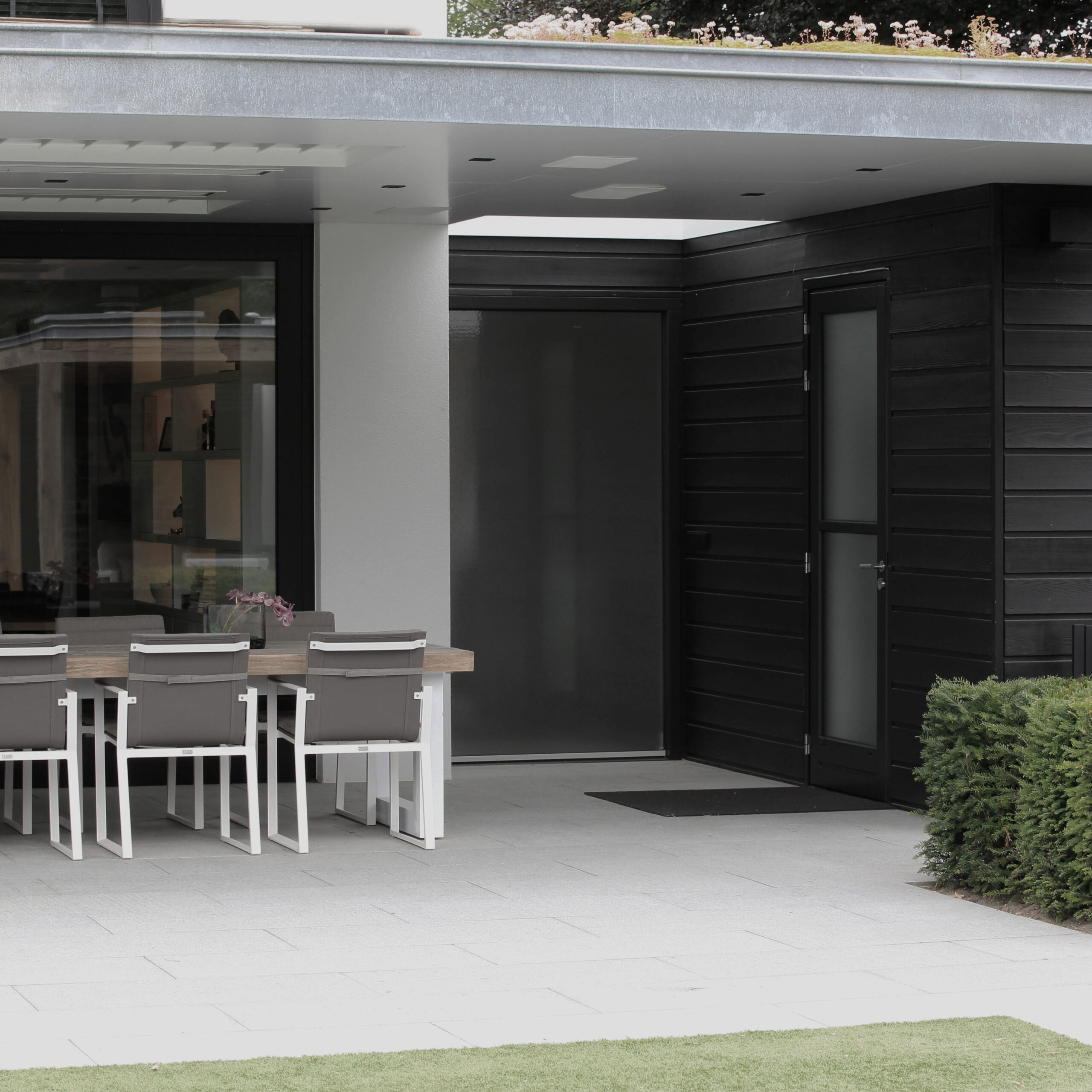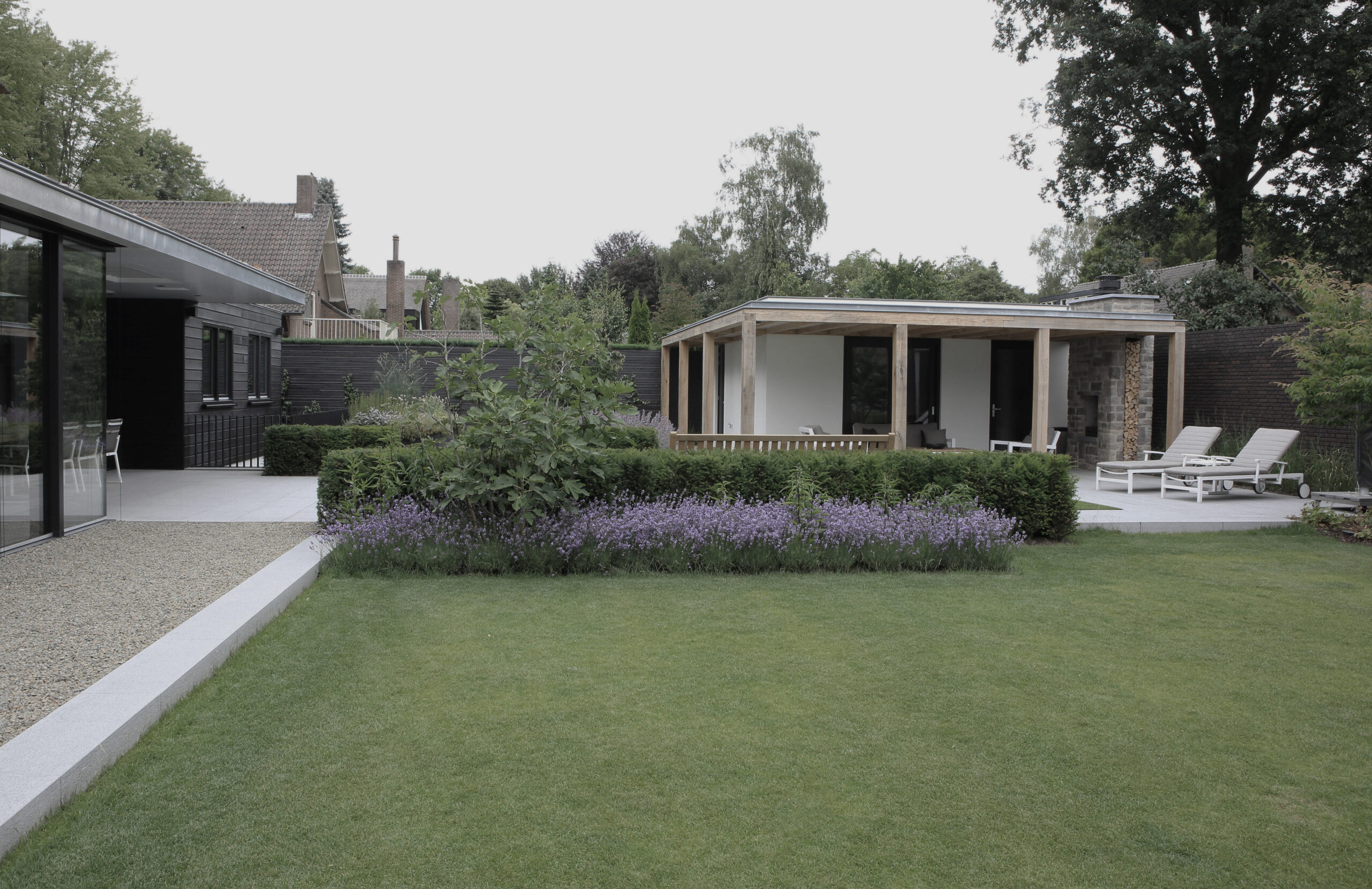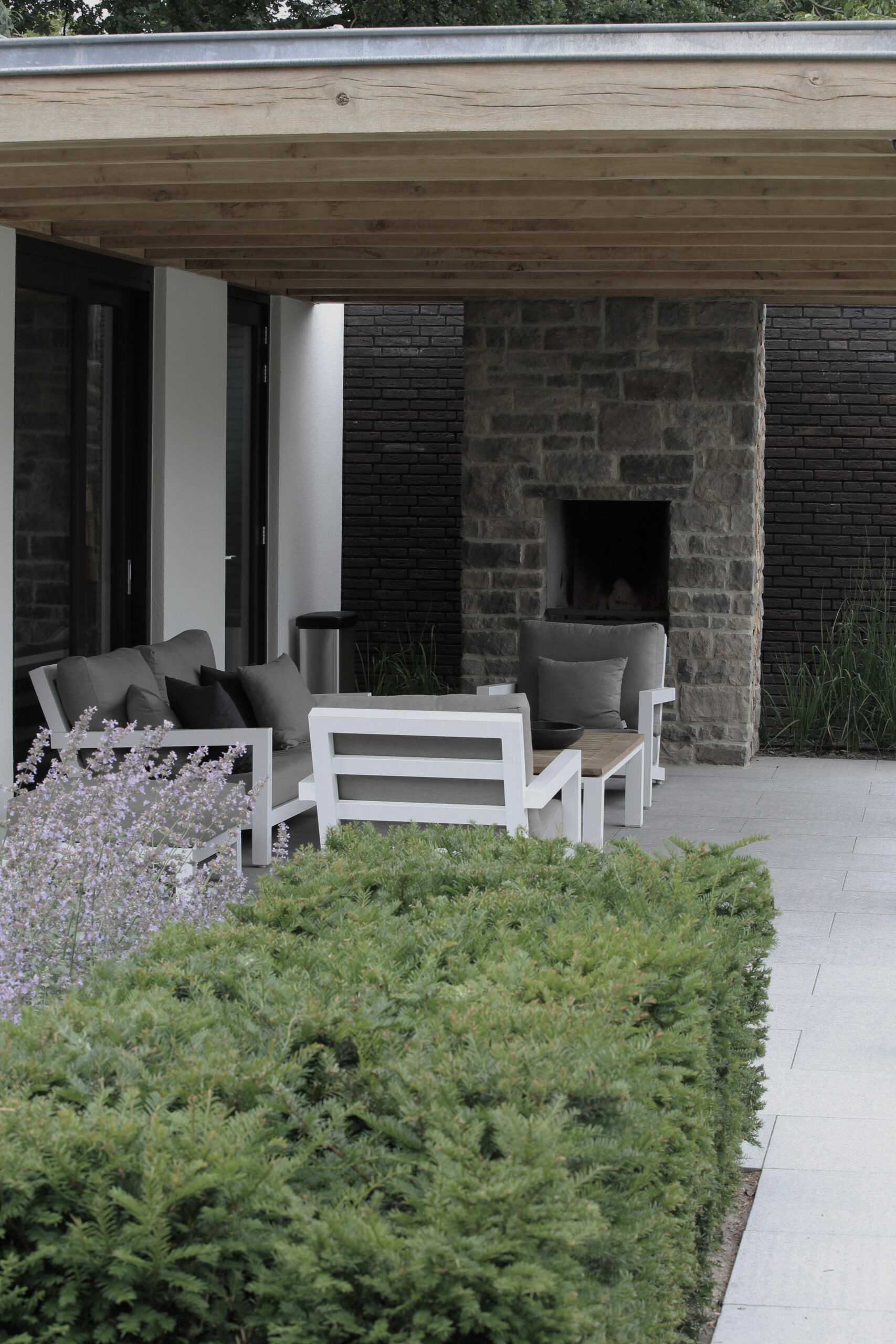 Het poolhouse met overdekt terras en buitenhaard vormt het warme hart van de tuin. Onder het kunstgras wacht een toekomstig zwembad, discreet ingewerkt tot de kinderen oud genoeg zijn om ervan te genieten. Lage taxushagen versterken het lijnenspel en zorgen ervoor dat de tuin ook in de winter zijn structuur behoudt. Een plek waar luxe en comfort hand in hand gaan met huiselijkheid.