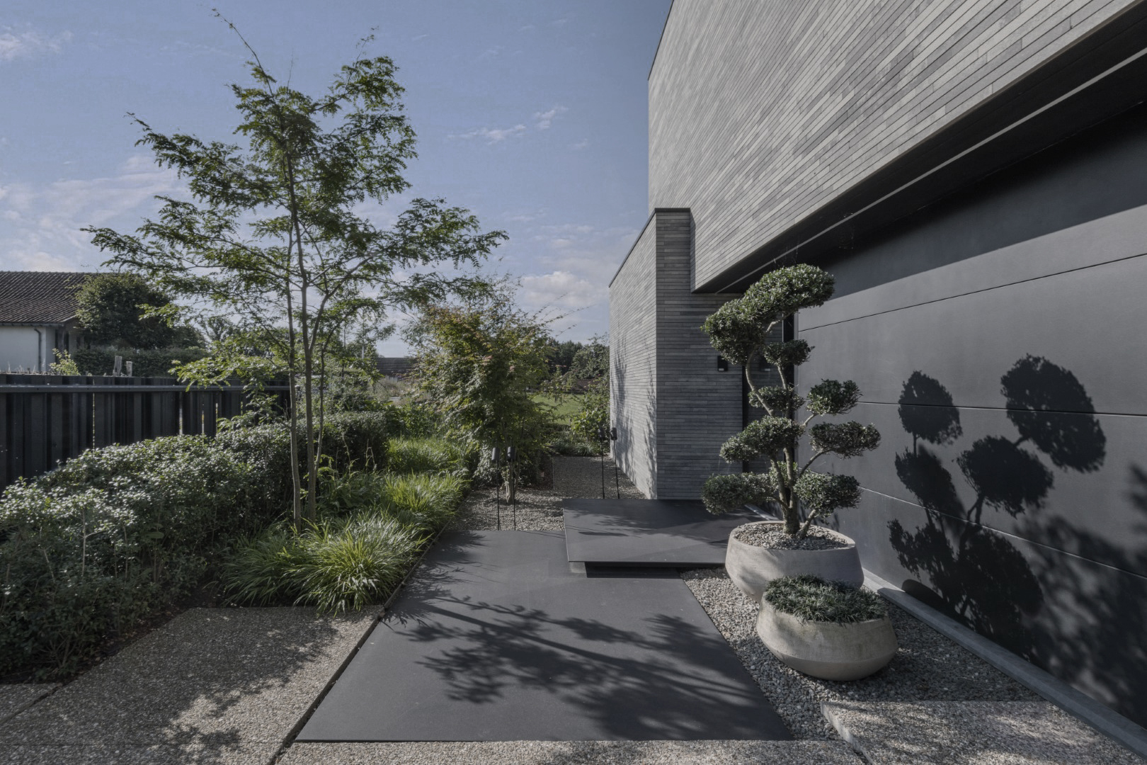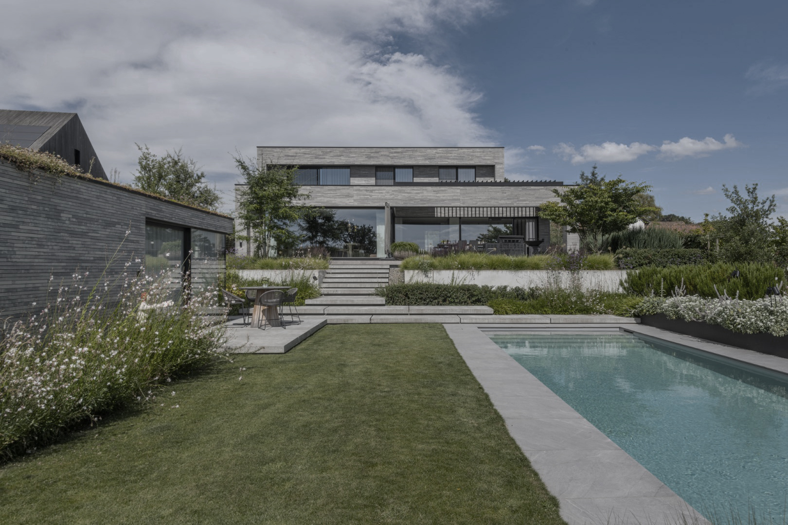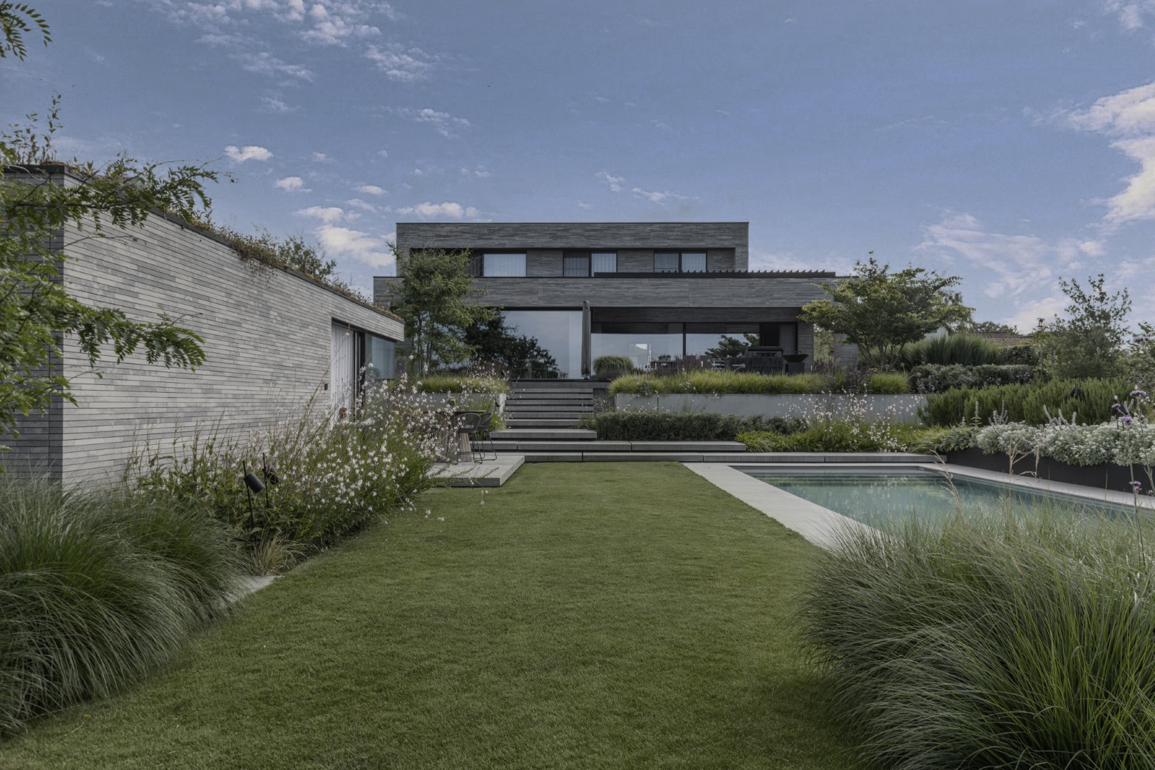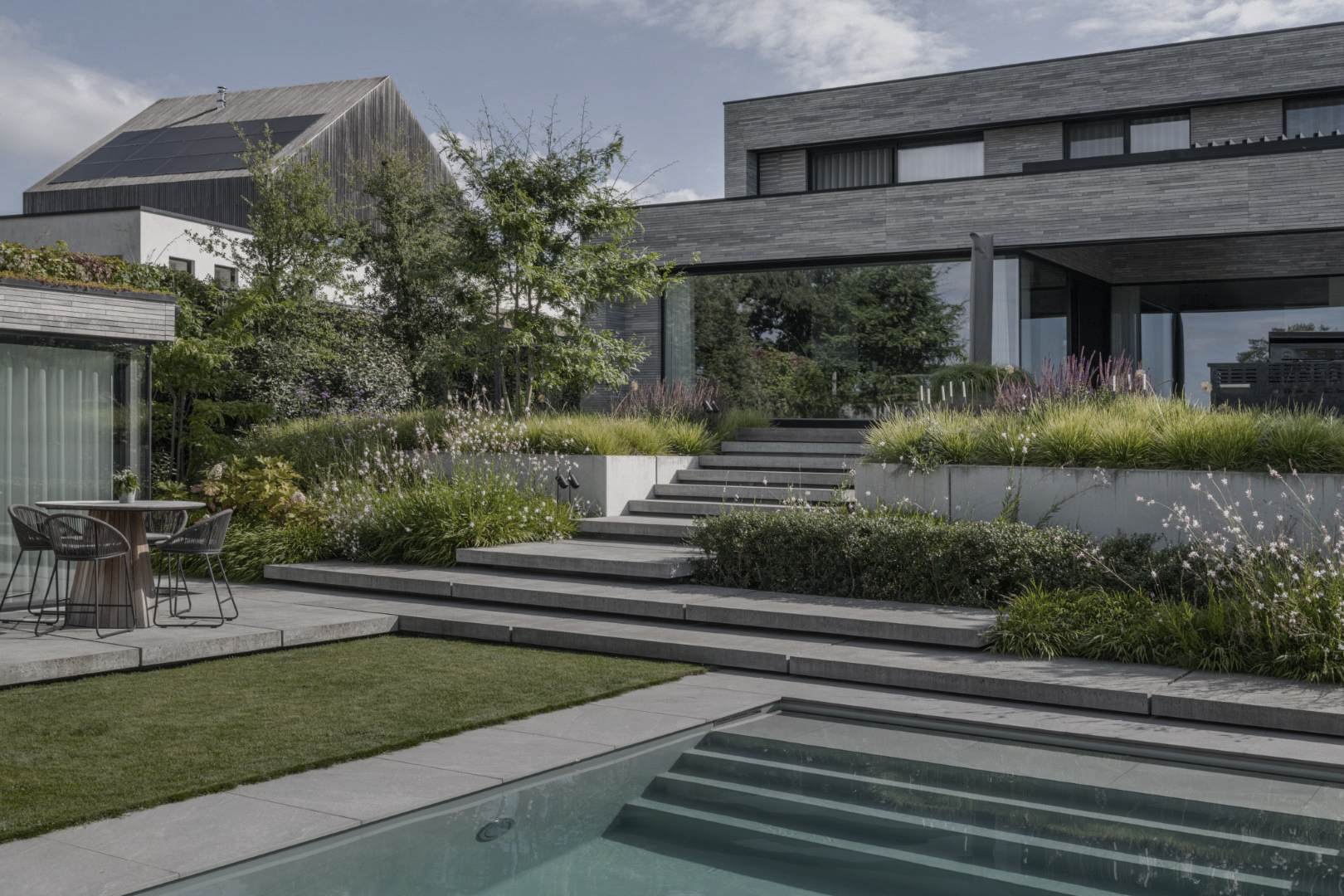Groene beplanting en zachtere trappartijen vormen nu elegante verbindingen tussen de verschillende tuindelen. Aan het zwembad zorgt een houten vlonder voor een uitnodigende plek om te loungen, terwijl lange, strakke staalbakken structuur brengen. In de voortuin is ruim parkeren mogelijk op een dynamisch gevormde oprit in uitgewassen beton. De inkompartij wordt gemarkeerd door twee grote staalplaten die zwevend over de betonstructuur kragen. Een transparante schuifpoort en sfeervol groen maken het geheel af.